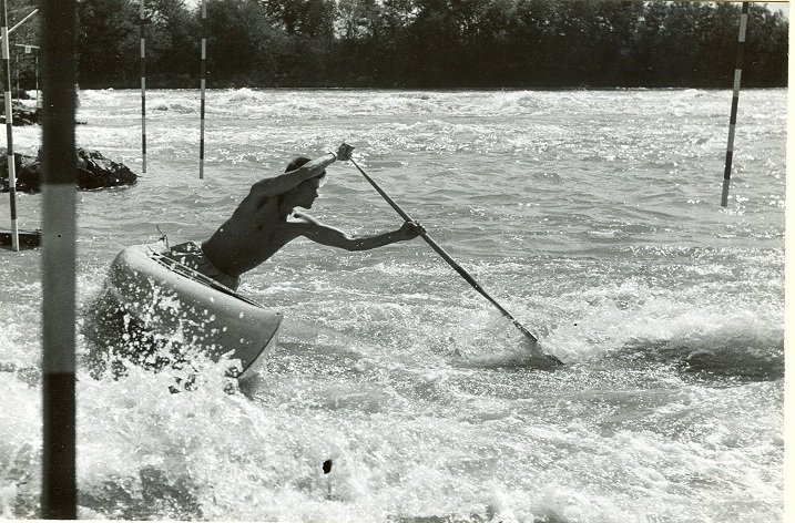 Milo’s guard got drunk in the festivities that followed the Worlds, and Milo escaped with the help of the Swiss team. He had traded his chance to be World Champion for a new life and freedom. From his new home in Switzerland, Duffek shared his paddling expertise with a fast-growing audience in many countries, including teaching the roll, surfing, and even eddy turns to an unfamiliar audience in the US. He won the silver medal in K-1 Slalom 1955 World Championships, and fourth place in K-1 Slalom at the 1959 World Championships. He was also the first racer to introduce flat water training techniques to whitewater racing.